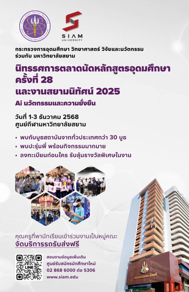มหาวิทยาลัยสยามร่วมกับกระทรวงการอุดมศึกษา วิทยาศาสตร์ วิจัยและนวัตกรรม เตรียมจัดงาน “นิทรรศการตลาดนัดหลักสูตรอุดมศึกษา ครั้งที่ 28 และงานสยามนิทัศน์ 2025” ระหว่างวันที่ 1–3 ธันวาคม 2568 ณ ศูนย์กีฬา มหาวิทยาลัยสยาม โดยมุ่งเน้นการนำเสนอเทคโนโลยี นวัตกรรมด้าน AI และแนวคิดการพัฒนาที่ยั่งยืนให้แก่นักเรียน นักศึกษา และผู้สนใจทั่วไป