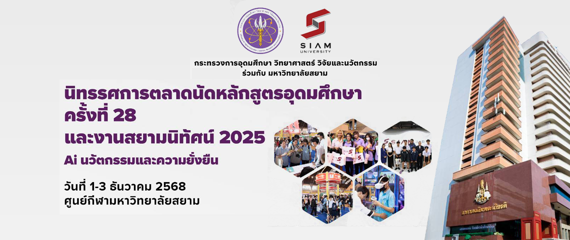 มหาวิทยาลัยสยามร่วมกับกระทรวงการอุดมศึกษา วิทยาศาสตร์ วิจัยและนวัตกรรม เตรียมจัดงาน “นิทรรศการตลาดนัดหลักสูตรอุดมศึกษา ครั้งที่ 28 และงานสยามนิทัศน์ 2025” ระหว่างวันที่ 1–3 ธันวาคม 2568 ณ ศูนย์กีฬา มหาวิทยาลัยสยาม โดยมุ่งเน้นการนำเสนอเทคโนโลยี นวัตกรรมด้าน AI และแนวคิดการพัฒนาที่ยั่งยืนให้แก่นักเรียน นักศึกษา และผู้สนใจทั่วไป