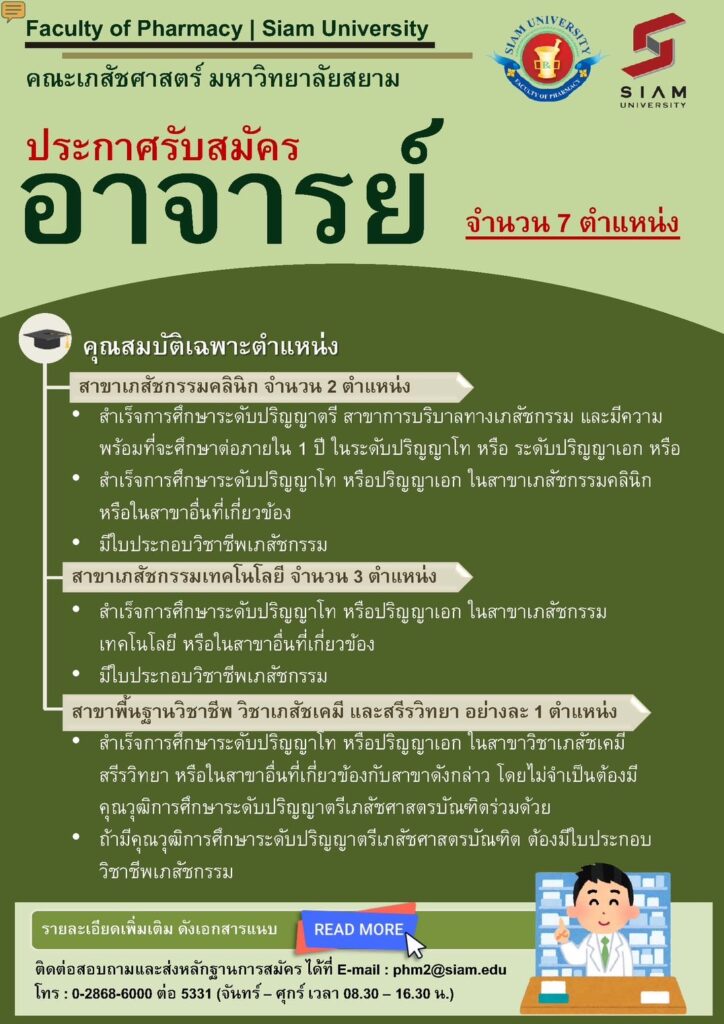 รับสมัครอาจารย จำนวน 7 ตำแหน่ง ประจำคณะเภสัชศาสตร์ มหาวิทยาลัยสยาม