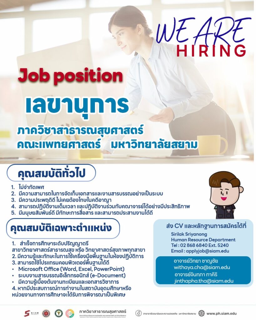 รับสมัครเลขานุการ ภาควิชาสาธารณสุขศาสตร์ คณะแพทยศาสตร์ มหาวิทยาลัยสยาม