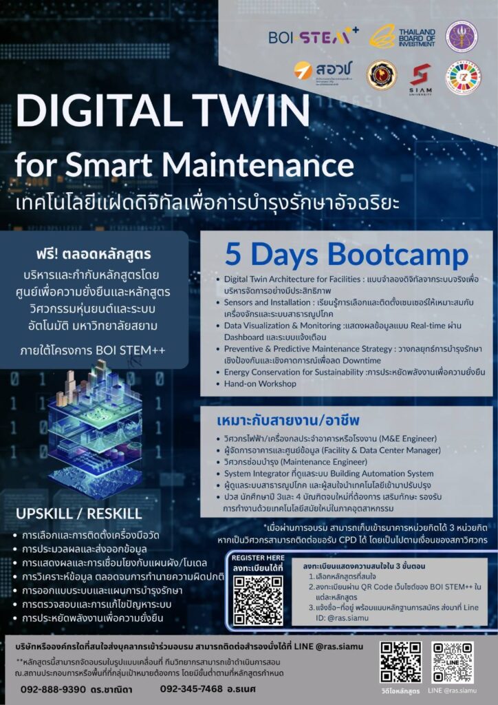 🌐 2. หลักสูตรเทคโนโลยีแฝดดิจิทัลเพื่อการบำรุงรักษาอัจฉริยะ (Digital Twin for Smart Maintenance) Boot camp 5 วัน ยกระดับงานบำรุงรักษาให้ก้าวสู่ Smart Maintenance ด้วยเทคโนโลยี Digital Twin ที่ช่วยจำลองระบบอาคารหรือโรงงานแบบเสมือนจริง เชื่อมโยงข้อมูลจากหน้างานแบบ Real-time วิเคราะห์สถานะเครื่องจักร คาดการณ์ความผิดปกติ ลด Downtime เพิ่มประสิทธิภาพ และประหยัดพลังงานอย่างยั่งยืน