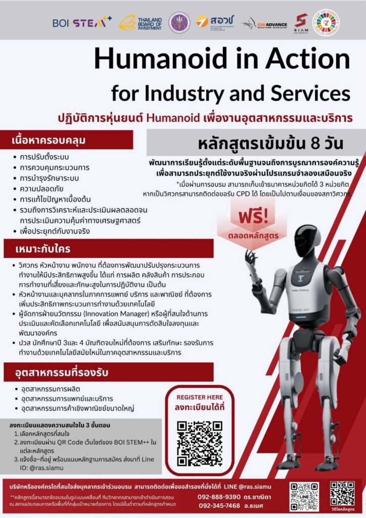 🤖 1. หลักสูตรปฏิบัติการหุ่นยนต์ Humanoid เพื่องานอุตสาหกรรมและบริการ (Humanoid in Action for Industry and Services)เป็นหลักสูตรเข้มข้น 8 วัน พัฒนาการเรียนรู้ตั้งแต่ระดับพื้นฐานจนถึงการบูรณาการองค์ความรู้ เพื่อสามารถประยุกต์ใช้งานจริงผ่านโปรแกรมจำลองเสมือนจริง
