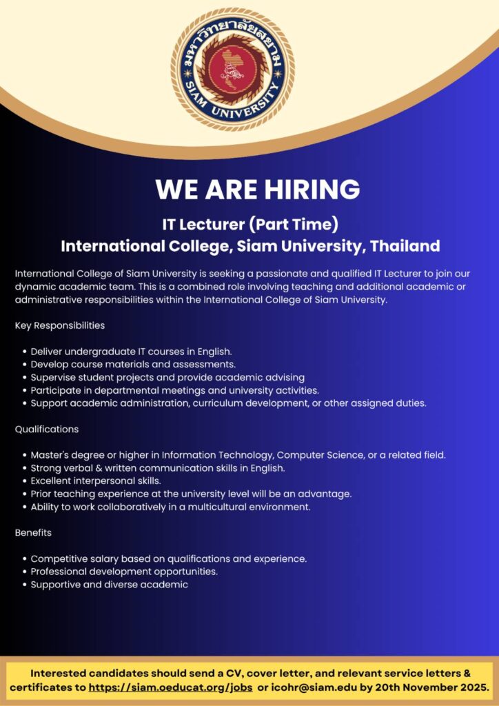 International College of Siam University is seeking a passionate and qualified IT Lecturer to join our dynamic academic team. This is a combined role involving teaching and additional academic or administrative responsibilities within the International College of Siam University.