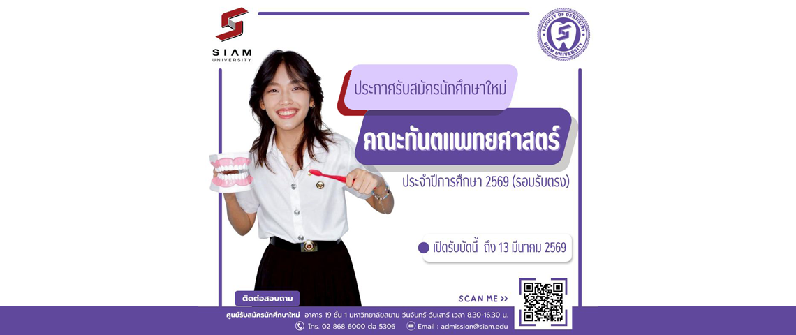 หลักสูตรทันตแพทยศาสตรบัณฑิต คณะทันตแพทยศาสตร์ มหาวิทยาลัยสยาม ประจำปีการศึกษา 2569 (รอบรับตรง)