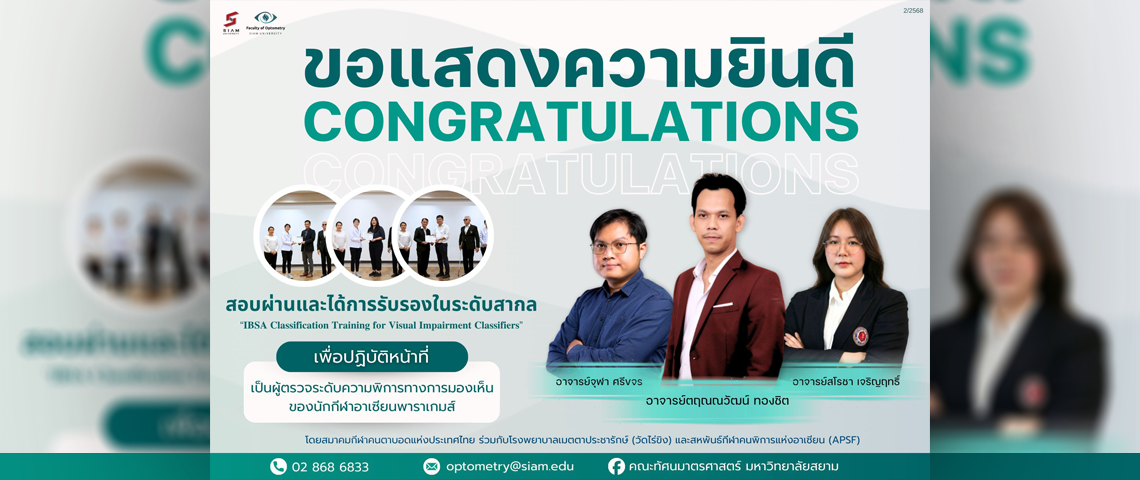 มหาวิทยาลัยสยาม ขอแสดงความยินดีกับ คณาอาจารย์คณะทัศนมาตรศาสตร์ที่สอบผ่านและได้รับการรับรองในระดับสากล