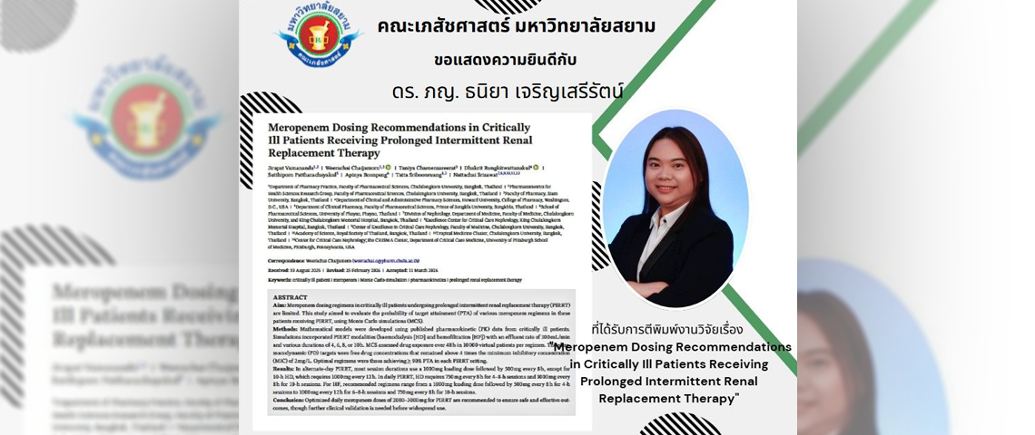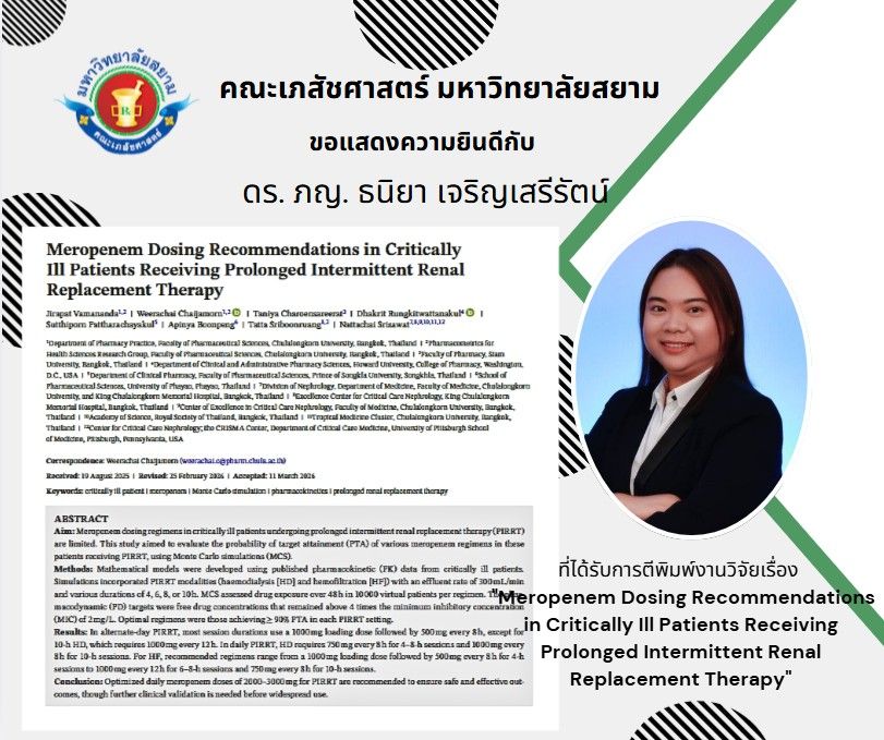 คณะเภสัชศาสตร์ ขอแสดงความยินดีกับ และ อ. ดร. ภญ. ธนิยา เจริญเสรีรัตน์ (co-author) และคณะ ที่ได้รับการตีพิมพ์งานวิจัยในหัวข้อ “Meropenem Dosing Recommendations in Critically Ill Patients Receiving Prolonged Intermittent Renal Replacement Therapy” ในวารสาร Nephrology อยู่ในฐานข้อมูล Scopus Q2